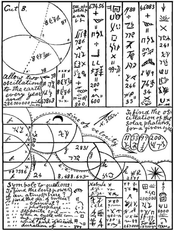 i100 Cevorkum, Roadway of Solar Phalanx. a, a, a, lines of different currents; b, b, b, transverse currents. The crossings denote the localities of the highest etherean light. The numbers, with their signatures, show the densities through which the great serpent passes each cycle. The lines across the cevorkum denote a cycle of three thousand years, but overdrawn (magnified) one thousand times in order to be apparent to the eye, i.e., one to 4,700,000. || Where the image says: [This is] Cut A. See next page || this points to cut B, which is image i101 (with text): Mathematics of Planetary Oscillations.